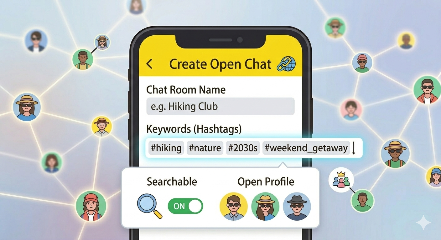 - 오픈채팅: 전화번호나 아이디 공유 없이 링크만으로 참여할 수 있는 익명 기반의 채팅방입니다. 불특정 다수와 취미나 정보를 공유할 때 최적입니다.