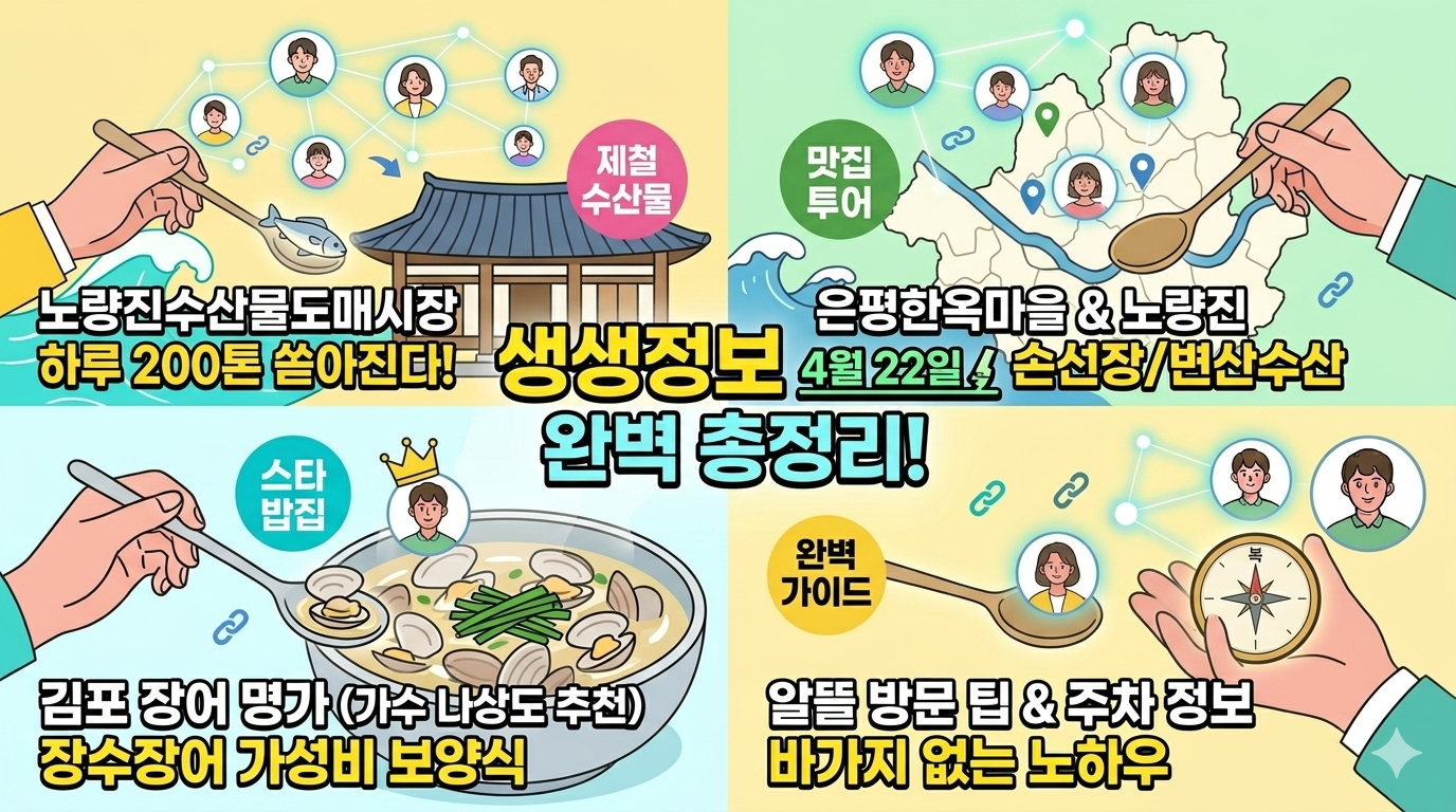 오늘 4월 22일 생생정보를 통해 살펴본 노량진의 활기찬 바다 향기와 김포의 든든한 장어 보양식 소식, 어떠셨나요? 사랑하는 가족들과 함께 싱싱한 회 한 접시, 혹은 노릇하게 구워진 장어구이로 이번 주말 행복한 외식을 즐겨보시는 건 어떨까요?